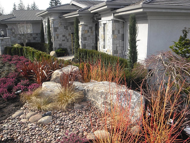 In this Meditteranean garden, the homeowners had a tight space to work with (their door is less than 25 feet from the curb!). The designers of this space maximized its potential by using iconic granite boulders which anchor the viewer's eyes to the ground, immediately grabbing visitors' attention. The granite works well with the stonework on the owner's home, providing architectural continuity. While so much stone might make a rigid design elsewhere, the elegant placement of Italian Cyprus (Cupressus sempervirens) softens the corners of this house, while the Yellow-twig dogwood (Cornus stolonifera (sericea) 'Flaviramea') provides excellent fall and winter color which are amplified, and produce striking effects during winter. Most people consider the space adjacent to the curb lost land, only to be used for grass lawns. These homeowners made a bold move that paid off when extending their low maintenance bed ofPhormium tenax and Heather Erica's all the way to the curb.